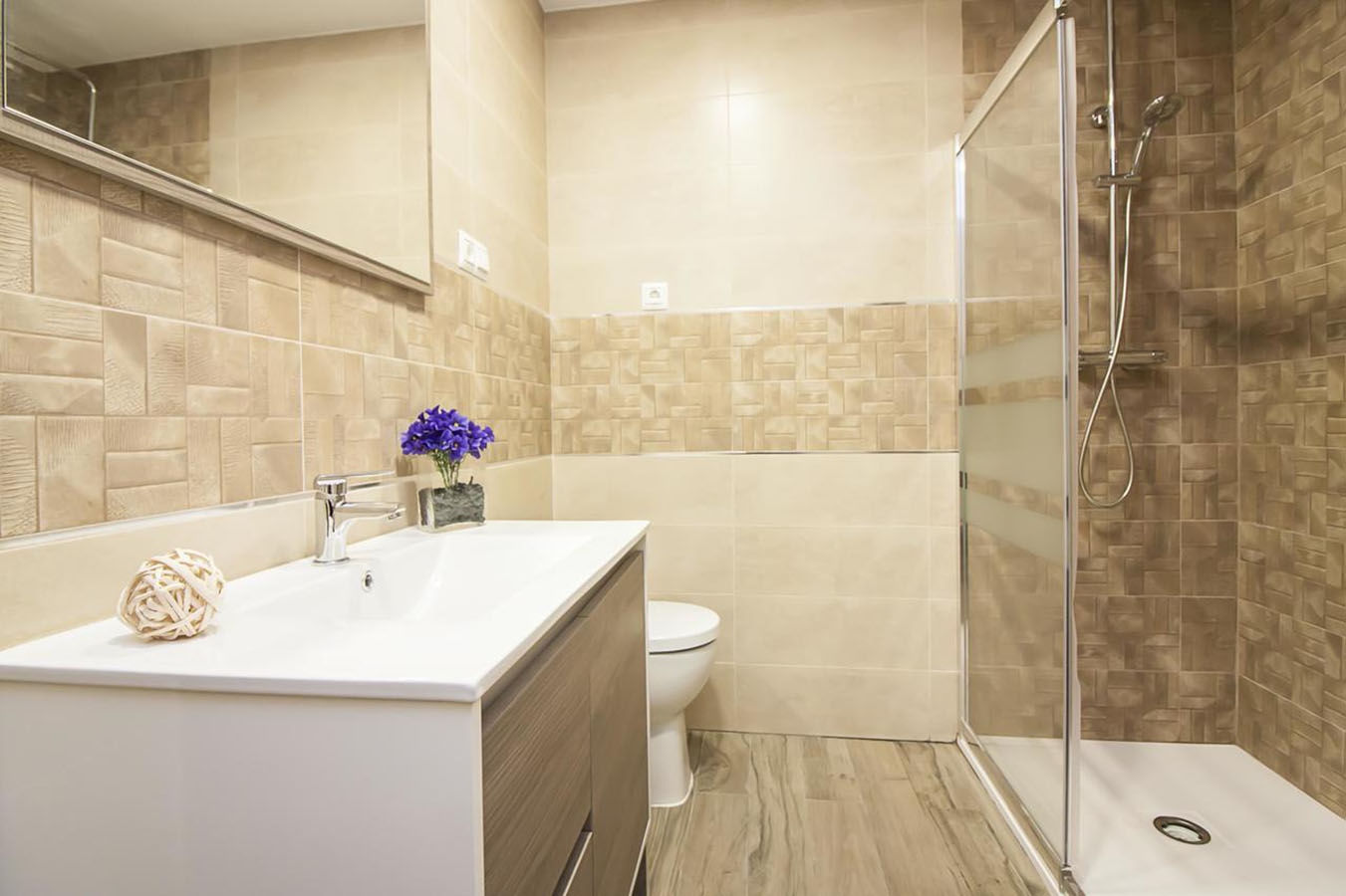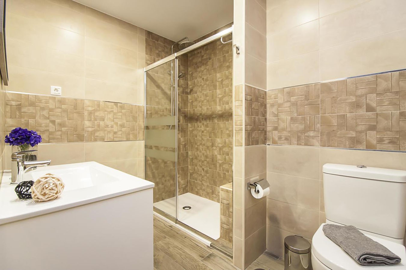 The bathroom is modern and functional, featuring a walk-in shower with dual showerheads and essential toiletries such as towels, shampoo, and soap. The apartment also includes a washing machine, clothesline, basic cleaning products, and air conditioning for a comfortable stay year-round.